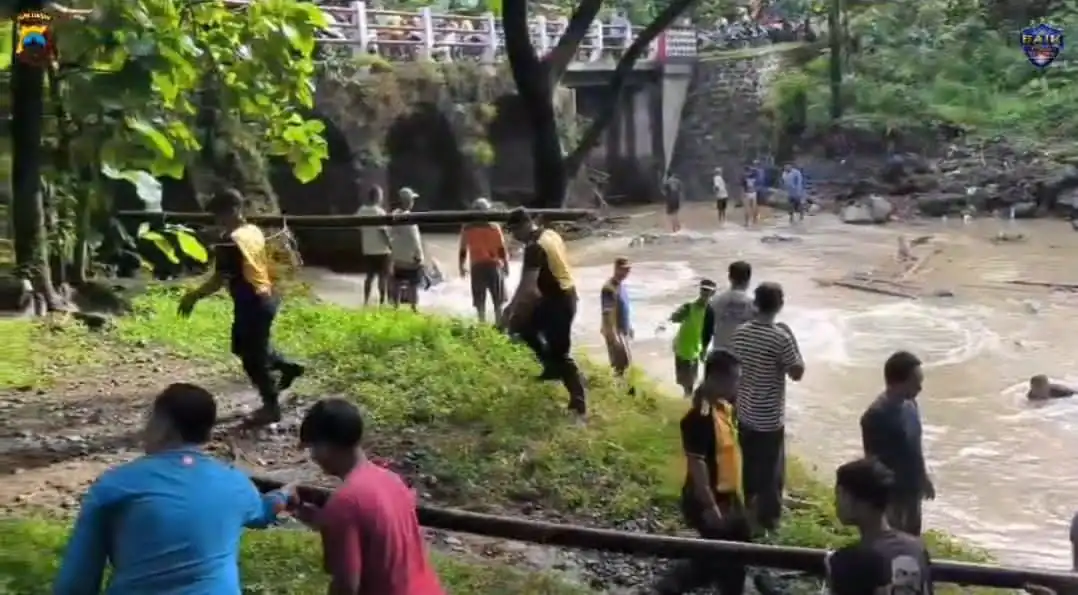 Warga sekitar pun tampak antusias terlibat. Dengan semangat gotong royong, mereka bersama aparat membersihkan material yang tersangkut di bawah jembatan hingga aliran sungai kembali lancar.